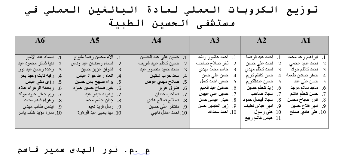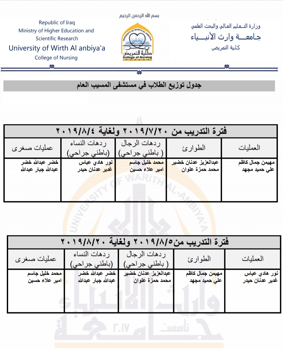 اعزائنا طلبة المرحلة الثانية اليكم توزيع الطلبة على ردهات المستشفى الحسيني بدءا من تأريخ ٢٠١٩/٨/٥ ولغاية ٢٠١٩/٨/٢٠.