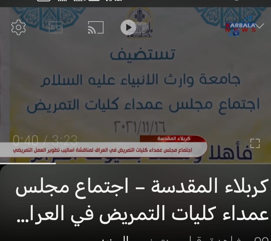 تغطية قناة كربلاء الفضائية لاجتماع مجلس عمداء الكليات في برنامج صباح كربلاء قامت قناة كربلاء الفضائية بتغطية الاجتماع لتناول اهم الامور المطلوبة لتطوير مهنة التمريض