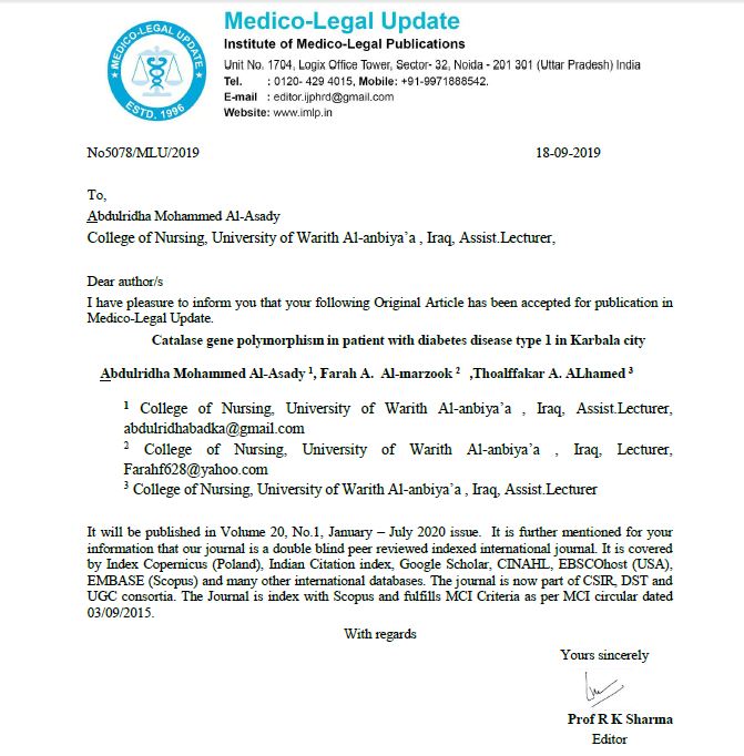 Medico-Legal Update) العالمية والمصنفة ضمن مستوعبات سكوبس (8 H Index) ، وعن موضوع البحث تحدث م.م.عبد الرضا الأسدي قائلاً: