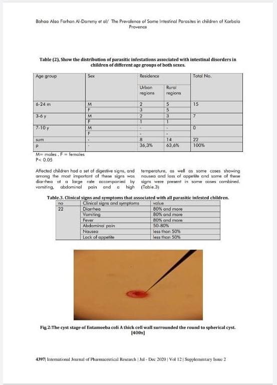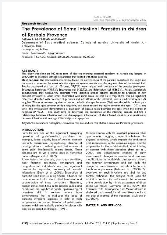 بتوفيق من الله تم نشر بحث مفرد في المجله العالميه (pharmaceutical Research ) والمصنفه ضمن مستوعبات سكوبس العالمي (Q2 scopus) للاستاذ الباحث ( م.م بهاء علاء فرحان ). البحث يتطرق الى مسح ميداني لمدى انتشار حالات الاصابه بالطفيليات الجهاز الهضمي intestinal parasite في الاطفال في محافظه كربلاء وحساب أليه تأثير الاصابه على المستوى الصحي للاطفال ودراست اهم الظواهر من علامات مرضيه شائعه تواكب الاصابه بهذا النوع من العدوى وتم التشخيص عن طريق جمع عينات من اطفال تظهر عليهم علامات هضميه من متوسطه الى شديده واستخدام طريقه الفحص المجهري المختبري...