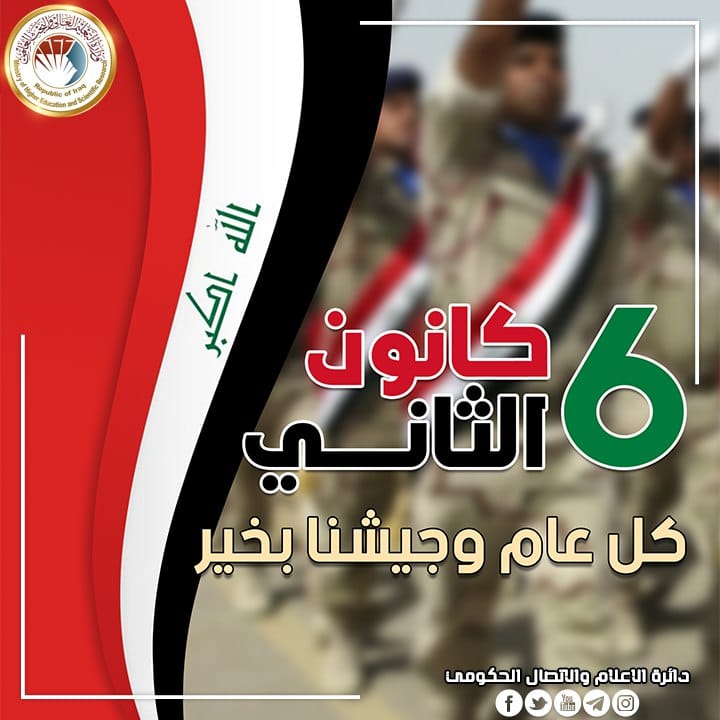 نهنئ جيشنا العراقي بعيده الوطني الذي يجسد تاريخا وحاضرا جديرا بتمثيل العراق وشعبه وأرضه المقدسة التي احتضنت التضحيات والبطولات والانتصارات التي سطرها أبناء هذا البلد العريق في الدفاع عن وجودهم وهويتهم وانتمائهم الوطني.