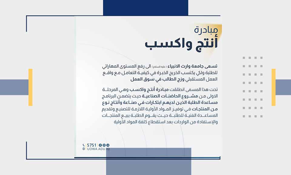 أطلقت جامعة وارث الأنبياء (عليه السلام) مبادرة (أنتج واكسب) ضمن مشروع الحاضنات الصناعية، بهدف تمكين الطلبة من تحويل أفكارهم إلى منتجات قابلة للتسويق، مع توفير المواد الأولية والدعم الفني واللوجستي كما تُتيح للطلبة فرصة تسويق منتجاتهم والاستفادة من عوائدها المادية، مما يسهم في تنمية مهاراتهم العملية وبناء قدراتهم الريادية. وتنسجم هذه المبادرة مع رؤية الجامعة في إعداد جيل مبتكر قادر على الإسهام بفعالية في دعم الاقتصاد الوطني وتحقيق التنمية الصناعية المستدامة في العراق.