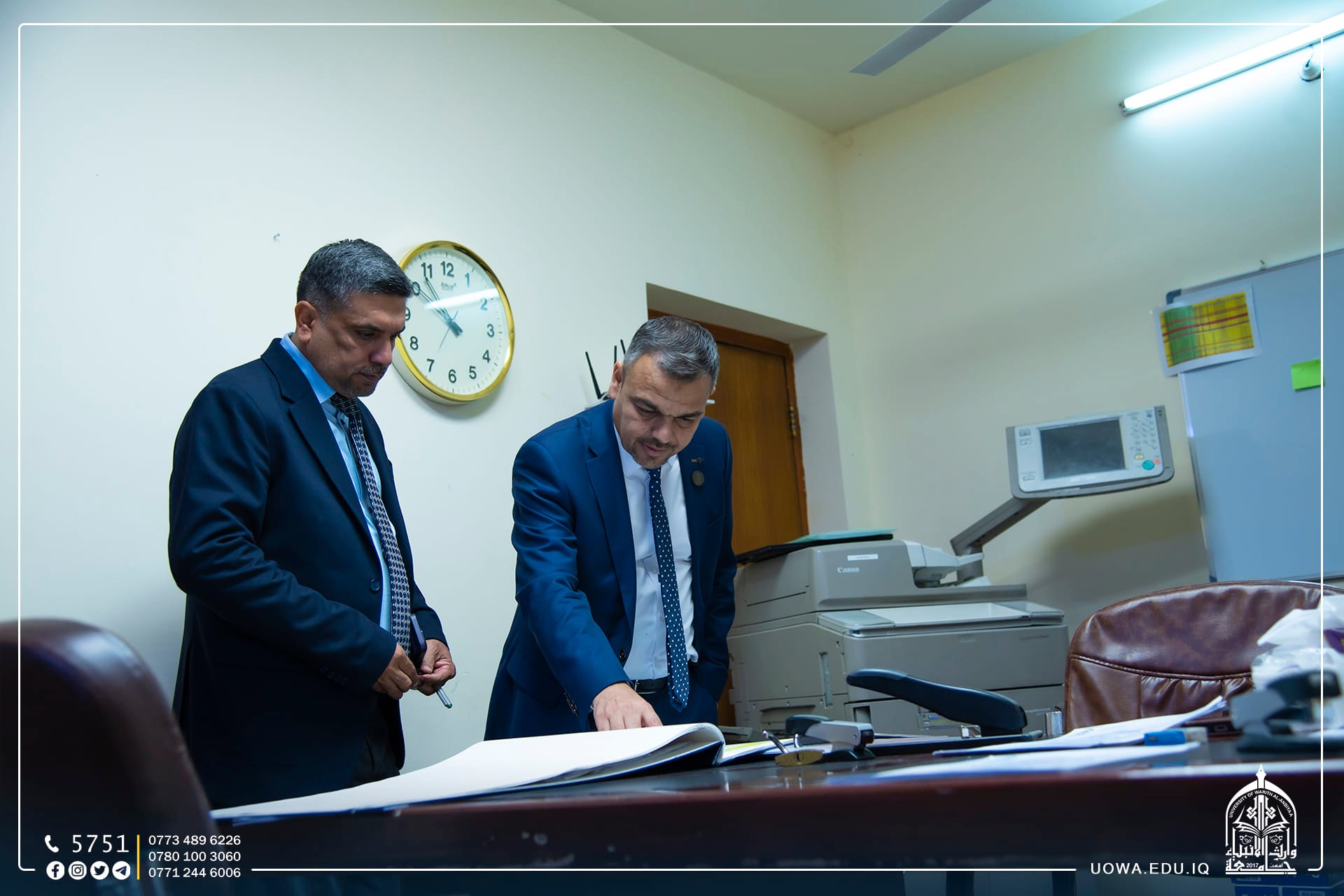 بالصور.. جولة تفقدية للسيد المساعد العلمي الاستاذ الدكتور واقد الموسوي يرافقه السيد رئيس قسم البعثات والعلاقات الثقافية المدرس الدكتور مهدي محمد مهدي داخل اروقة الجامعة، ولقاء عدد من السادة عمداء الكليات، ورؤساء الاقسام لمتابعة الأعمال المنجزة ،والخطط المرسومة وآليات العمل وتطويرها بما يتلائم وتطلعات رئاسة الجامعة.