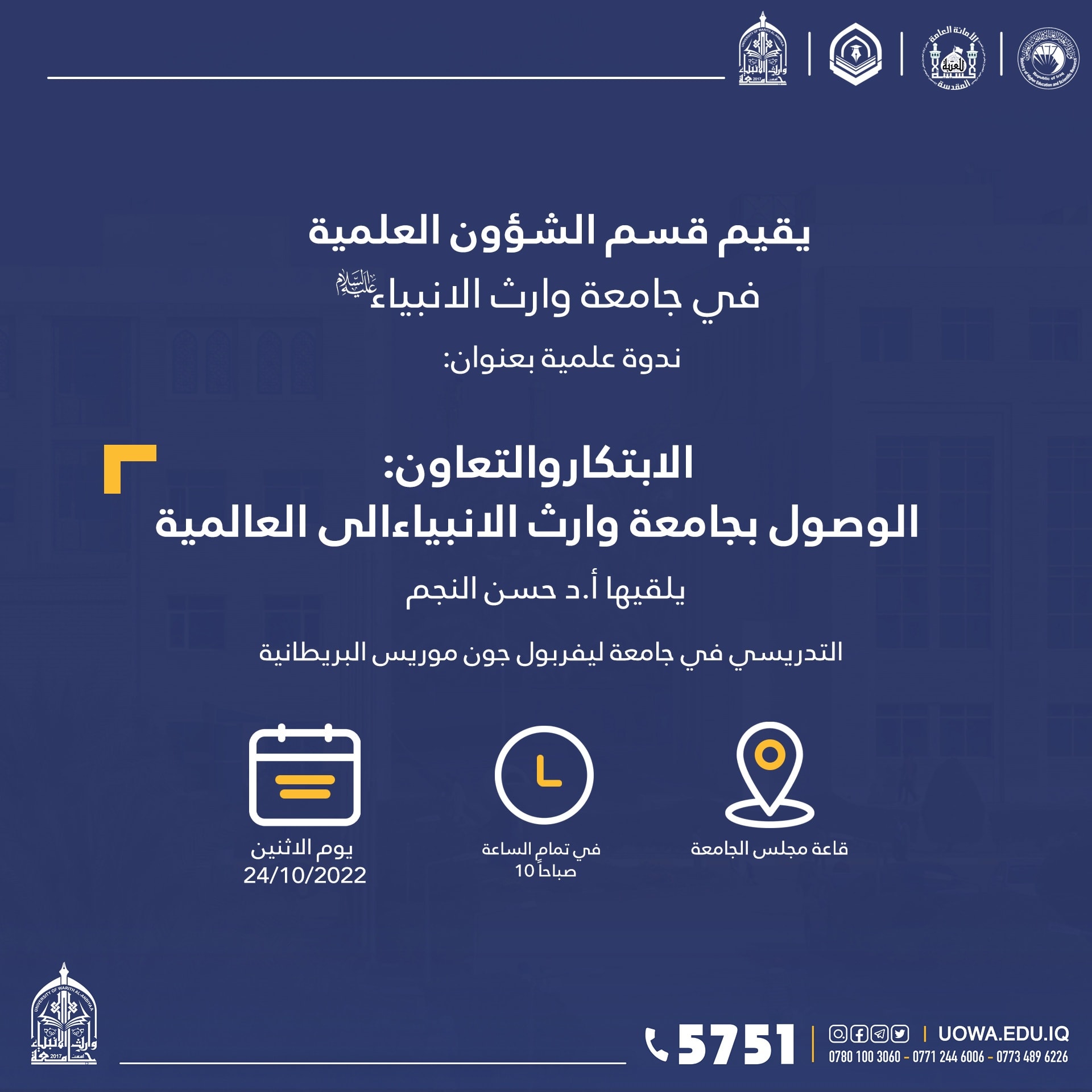 ضمن خطواتها الجدية للنهوض بالواقع العلمي في الجامعة للوصول الى مصاف الجامعات العالمية، وبرعاية السيد رئيس الجامعة الاستاذ الدكتور ابراهيم الحياوي، اقام قسم الشؤون العلمية في جامعة وارث الانبياء(عليه السلام) ورشة عمل بعنوان: (الابتكار والتعاون-الوصول بجامعة وارث الانبياء الى العالمية) قدمها البروفيسور حسن النجم رئيس مركز تطوير المواد الانشائية في جامعة ليفربول جون مورس البريطانية، والاستاذ المساعد الدكتور انمار فالح ديكان وجاءت هذه الورشة للسادة معاوني عمداء كليات الجامعة والسادة رؤساء الاقسام العلمية والسادة التدريسيين الافاضل. استعرضوا فيها التجارب العالمية للاستفادة منها لتطبيقها في الجامعة في ظل التطورات العلمية المتسارعة في المجالات والتخصصات المتنوعة.