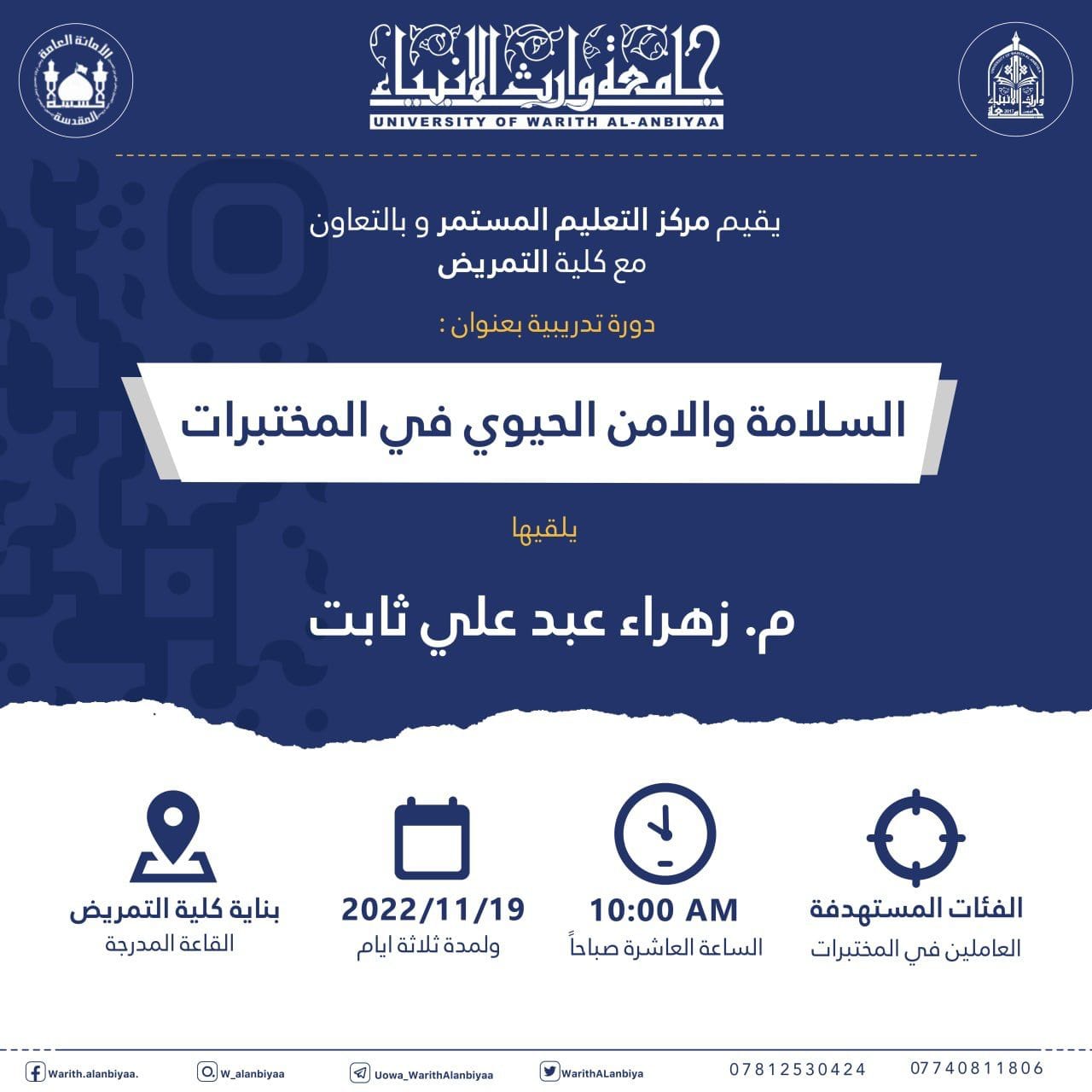 قدمها المدرس علي عبد الزهرة رئيس قسم ضمان الجودة ،ومسؤولة الاعتماد المختبري الست حوراء احمد هادي،استهدفت الملاكات العاملة في مختبرات الجامعة ، وجاءت الدورة لتدريبهم على إجراءات الجودة العالمية في مواصفات ISO 17025 وكذلك المواصفات الوزارية الخاصة بالمختبر التعليمي الجيد GLP .
