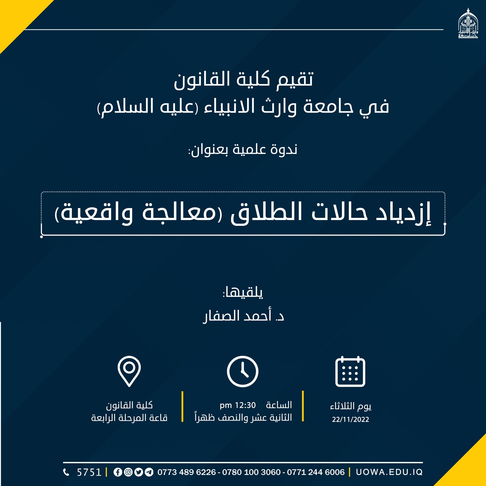 يقيم قسم الشؤون العلمية_ وحدة تمكين المرأة في جامعة وارث الأنبياء (عليه السلام)، ندوة علمية بعنوان العنف ضد المرأة في تمام العاشرة من صباح يوم السبت