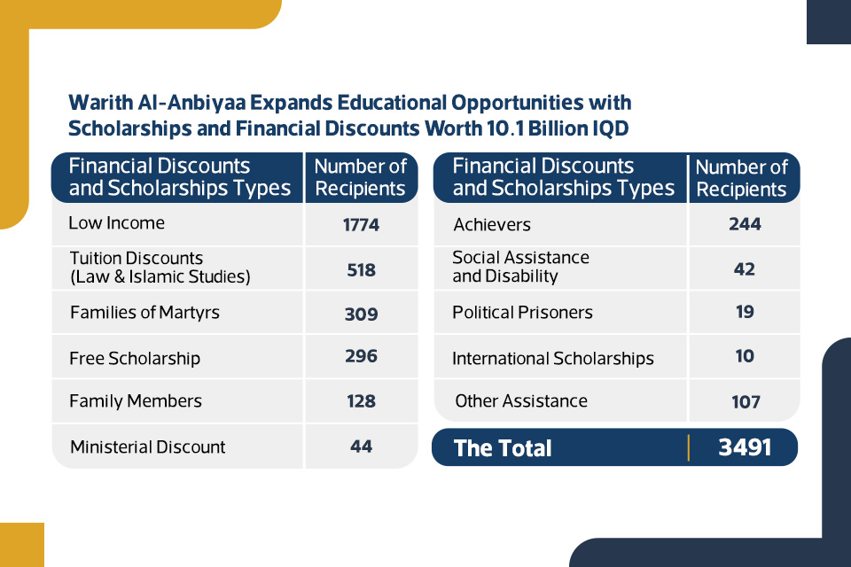 As part of this commitment we offer discounts and full scholarships to all Iraqis and non-Iraqis who meet certain criteria. These include individuals with siblings enrolled at our university, those with exceptional academic achievements, memorizers of the Holy Quran, and individuals from low-income families. We believe that education is a basic human right, and we are proud to provide individuals who deserve access to high-quality education. In view of this, the financial aid granted by the University of Heir al-Anbiya (peace be upon him) to its dear students during the year (2022) reached (four billion Iraqi dinars) (4,162,448,500).