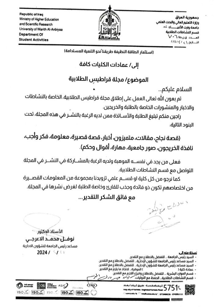 With the help of God Almighty, work has been done to launch the Qaratis student magazine, which specializes in activities, news, and publications for students and graduates, for students and professors who wish to publish in this magazine under the following items: (Success story, articles, distinguished people, news, short story, information, obligatory thought, Alumni window, university photos, skills, sayings and wisdom) Anyone who finds himself talented and has the desire to participate in publishing in the magazine should contact the Student Activities Department