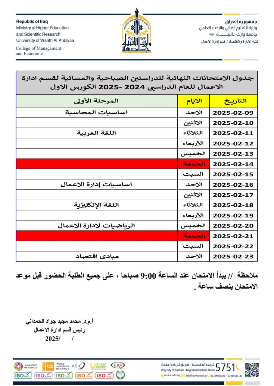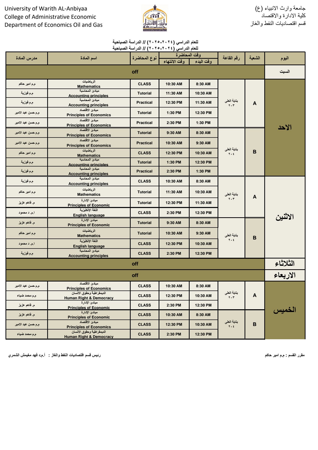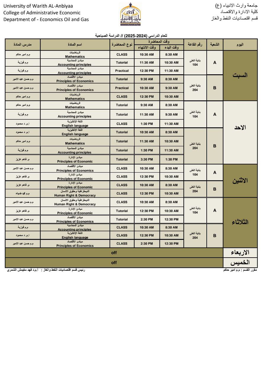 May the peace, mercy, and blessings of God be upon you. With the beginning of the new academic year for our dear students, we attach to you the schedule for the second stage of the Department of Oil and Gas Economics, wishing everyone success and prosperity...