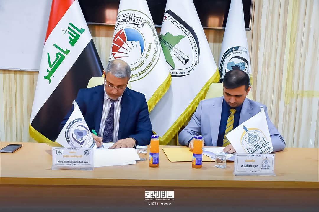 In its continuous effort to seriously improve the higher education system in our beloved country and serve our dear students, the College of Administration and Economics at Warith Al-Anbiya University (peace be upon him) signed a scientific cooperation agreement with the College of Industrial Administration for Oil and Gas at the University of Basra. Representing the university were the two assistants to the Dean of the College of Administration and Economics, Dr. Fahd Mughaymish Al-Shammari and Dr. Hussein Matouk, while representing the College of Industrial Administration was the Dean of the college, Professor Dr. Sami Obaid Al-Tamimi. The agreement included various academic and scientific activities, such as exchanging scientific visits, organizing conferences, joint research writing between the professors of both universities, as well as performance evaluation, scientific supervision, and student training programs.