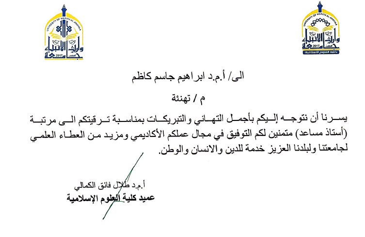 The College of Islamic Sciences congratulates Dr. Ibrahim Jassim Kazim Jaafar Al-Mousawi on obtaining the title of Assistant Professor