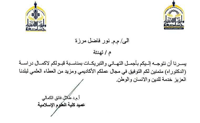 The Deanship of the College of Islamic Sciences at the University of Warith Al-Anbiya extends its warmest congratulations to the lecturer M.M. Nour Fadhel Marza Al-Jubouri on the occasion of her acceptance into postgraduate doctoral studies at the University of Karbala.