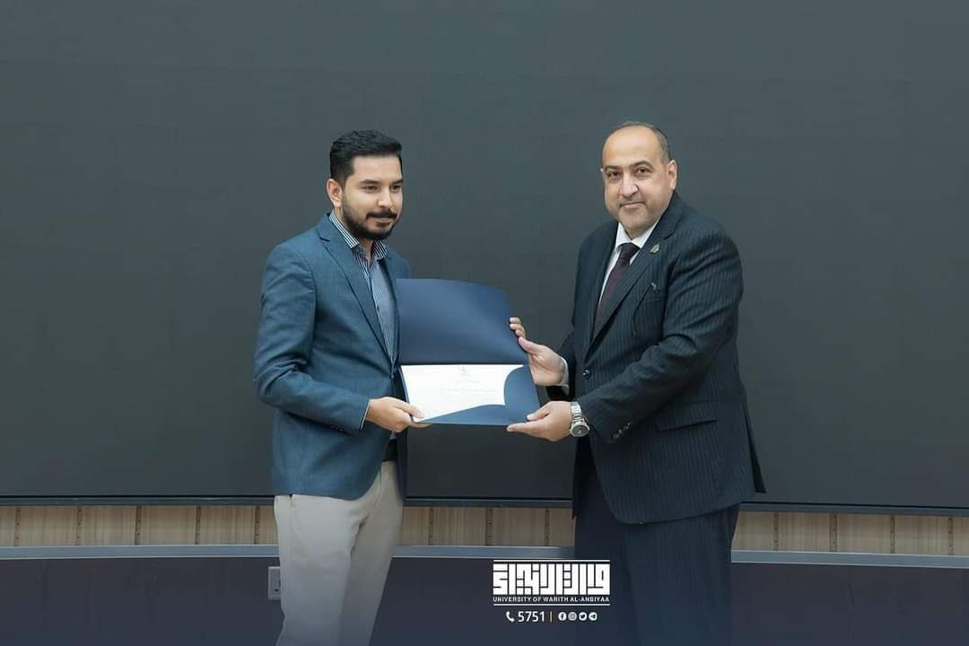 Assistant Lecturer Ali Karim Abdul Rahim, a lecturer at the College of Islamic Sciences at Warith Al-Anbiya University, received the Distinguished Lecturer Certificate from the University Presidency, during a ceremony held by the university to honor distinguished lecturers on Tuesday 10/1/2024 in the presence of the University President, Professor Dr. Ibrahim Saeed Al-Hayawi, the University President's Assistants, the Deans of the Colleges, and a number of lecturers.