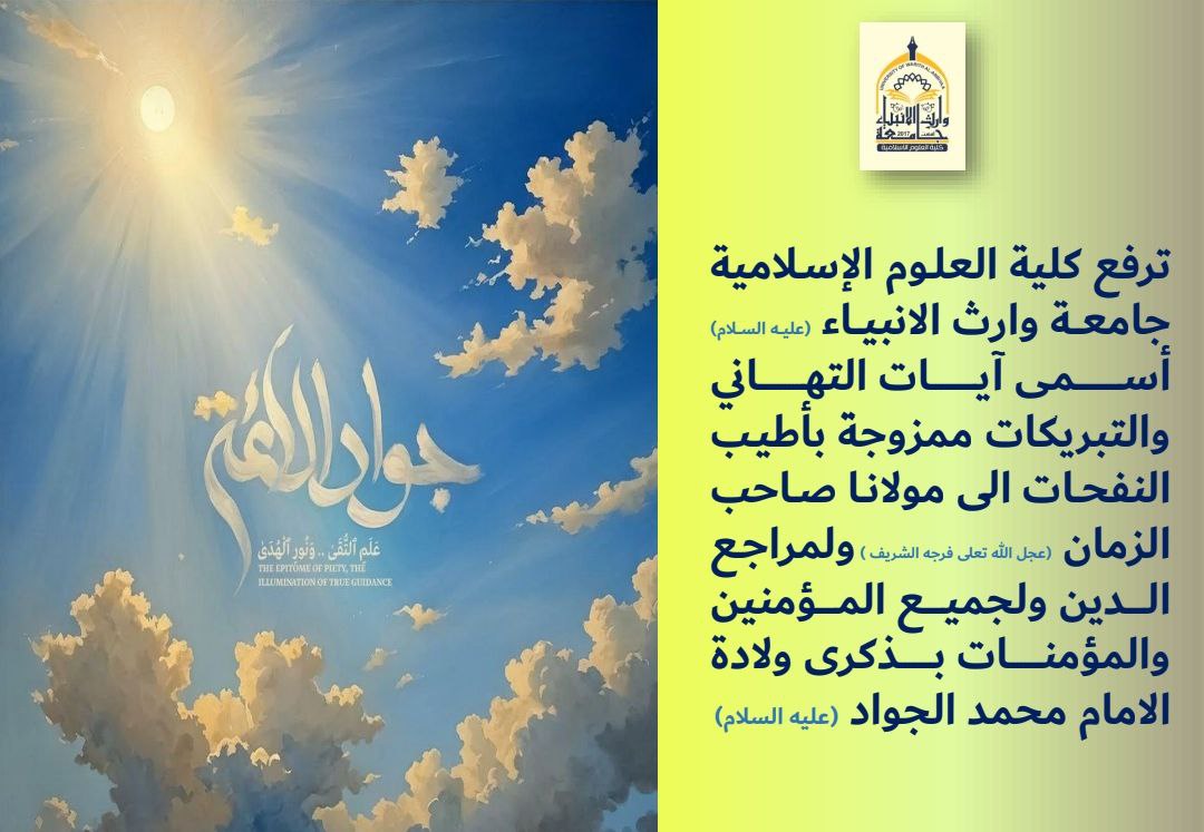 The College of Islamic Sciences, Warith al-Anbiya University (peace be upon him) extends its warmest congratulations and felicitations mixed with the best breezes to our Master, the Master of the Age (may Allah hasten his honorable reappearance) and to the religious authorities and to all believers, men and women, on the anniversary of the birth of Imam Muhammad al-Jawad (peace be upon him)