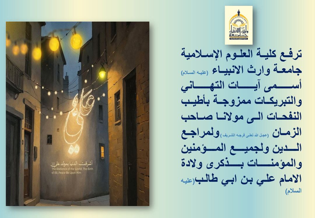 . The College of Islamic Sciences, Warith Al-Anbiyaa University (peace be upon him) extends the highest verses of congratulations and felicitations mixed with the best breezes to our Master, the Master of the Age (may Allah hasten his honorable reappearance) and to the religious authorities and to all believers, men and women, on the birth anniversary of Imam Ali bin Abi Talib (peace be upon him).
