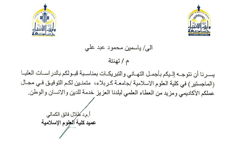 The College of Islamic Sciences at the University of Warith Al-Anbiya extends its warmest congratulations to its distinguished graduates, Yasmine Mahmoud and Qahtan Amer, for their acceptance into postgraduate studies in Karbala.