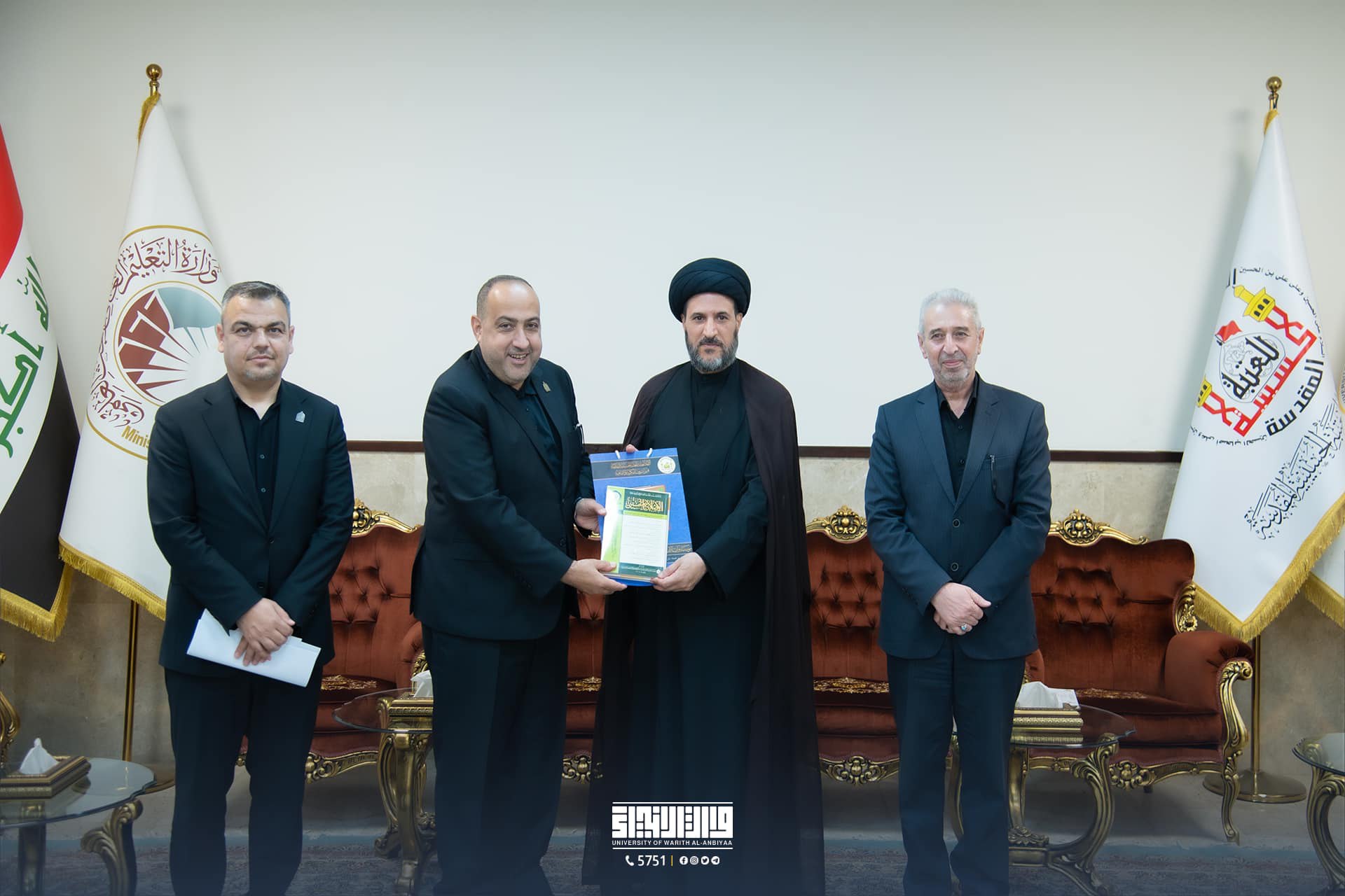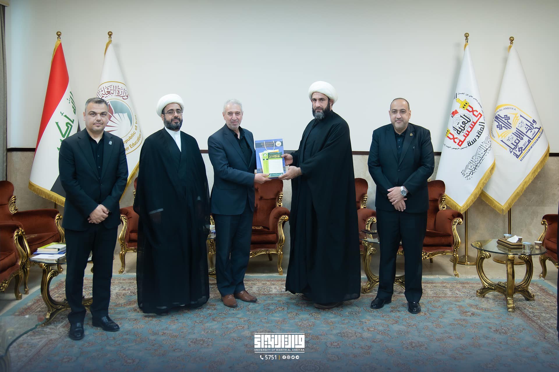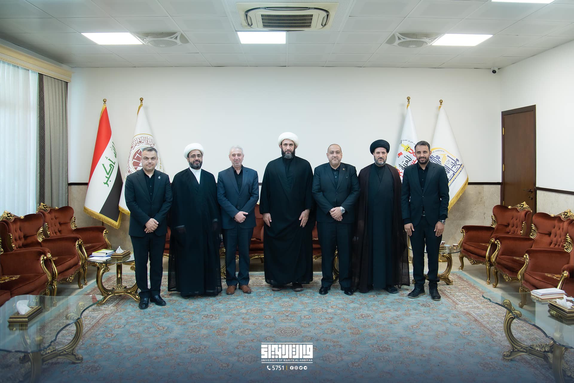 The President of Warith Al-Anbia University (peace be upon him), Professor Ibrahim Saeed Al-Hayawi, accompanied by Professor Dr. Waqid Al-Moussawi, Assistant President of the University for Scientific Affairs, and Assistant Professor Dr. Talal Faeq Al-Kamali, Dean of the College of Islamic Sciences, received a delegation from the Scientific Committee of Warith Al-Anbia Foundation for Specialized Studies in the Husseini Renaissance affiliated with the Holy Shrine of Imam Hussain.