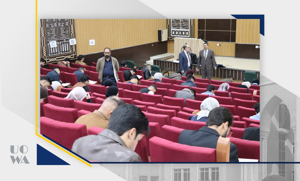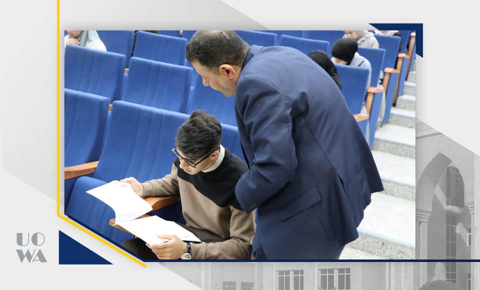 In the presence of the Dean of the College, Prof. Dr. Ali Abdul Saadoun, the Scientific Assistant, Assistant Professor Dr. Laith Al-Hussaini, and the Administrative Assistant, Lecturer Dr. Anwar Al-Dahan, the first stage exam for the subjects of Medical Terminology and Human Rights was conducted in eight classrooms, where the exams were conducted in an organized atmosphere according to the approved academic regulations and instructions. The Deanship of the College was keen to follow up on the progress of the exams in the field, and to ensure that the appropriate environment was provided for students to take their exams smoothly, while adhering to the organizational procedures that ensure transparency and justice. The importance of preparing the exam halls and providing the necessary supplies to ensure the comfort of students during the exam was also emphasized.