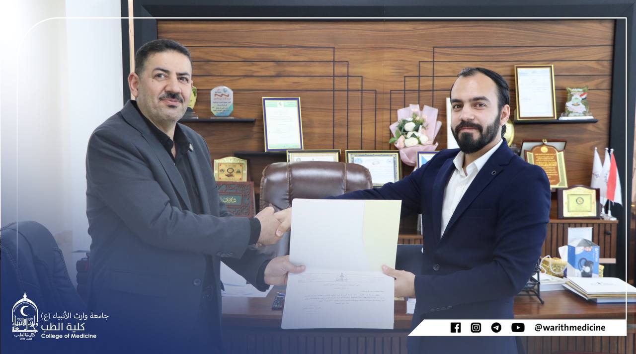The Deanship of the Faculty of Medicine, Warith Al-Anbiya University, peace be upon him, represented by the respected Dean, Professor Dr. Ali Abd Saadoun, honored both the employee (Hussein Majeed) and the employee (Younis Essam) for their efforts in conducting the end-of-course exams for first-year students, wishing them continued success in serving the students and the university.