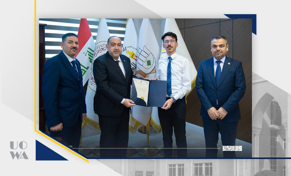 In a gesture that reflects the spirit of support and collaboration among the university’s colleges, the Dean of the College of Islamic Sciences, Dr. Talal Faeq Al-Kamali, honored Hajer Hussein, a student from the College of Engineering, in recognition of her first-place achievement in the “A Nation That Reads” competition at the level of Al-Warith Al-Anbiyaa University.