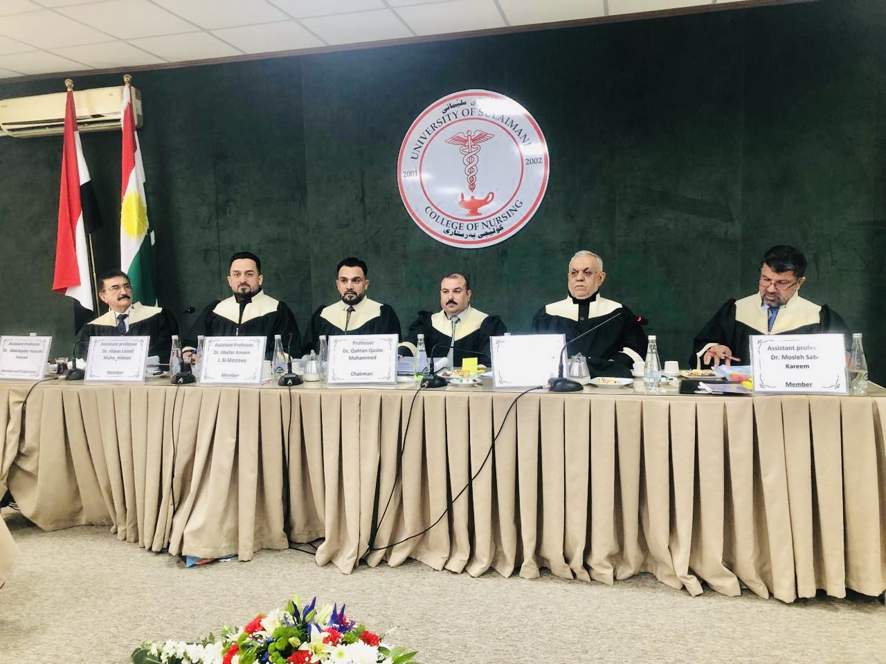 A lecturer from our university, College of Nursing (Assistant Professor Dhafer Amin Jabbar Al-Moussawi) was selected as a member to discuss the doctoral student (Lara Rashid Darwish) at the College of Nursing - University of Sulaymaniyah on her thesis entitled (The effect of the educational psychological program on the severity of symptoms among depression patients in the city of Sulaymaniyah, Iraq) on Thursday, February 27, 2025. The quasi-experimental study aimed to investigate the effect of the educational psychological program on reducing the severity of symptoms among depression patients, as well as their knowledge and commitment to treatment. The study concluded the effectiveness of the educational psychological program in reducing the severity of symptoms in patients with diseases and raising their level of knowledge and commitment to treatment through the presence of statistically significant differences in the measures used among patients in the experimental group compared to the control group. The study recommended the necessity of integrating the educational psychological program into the treatment plan for depression patients by health institutions.