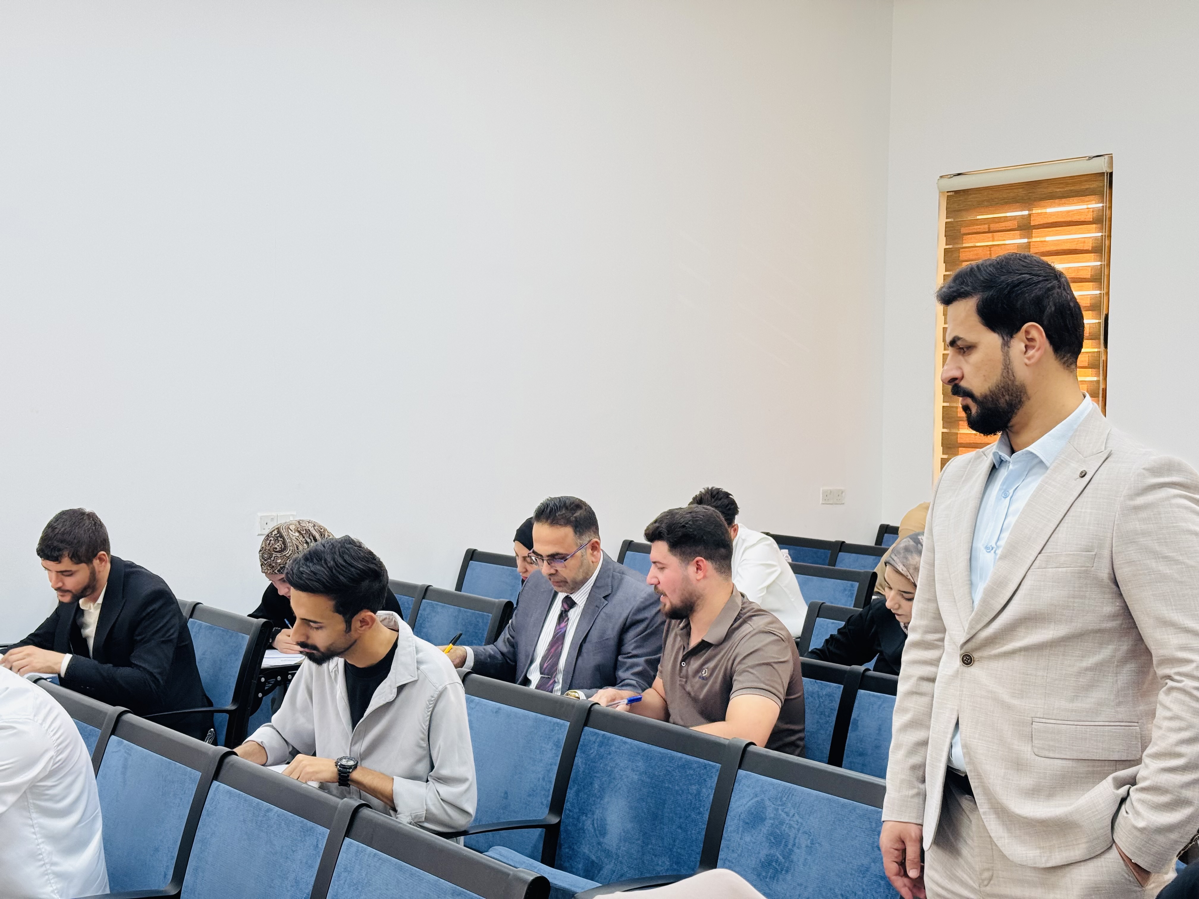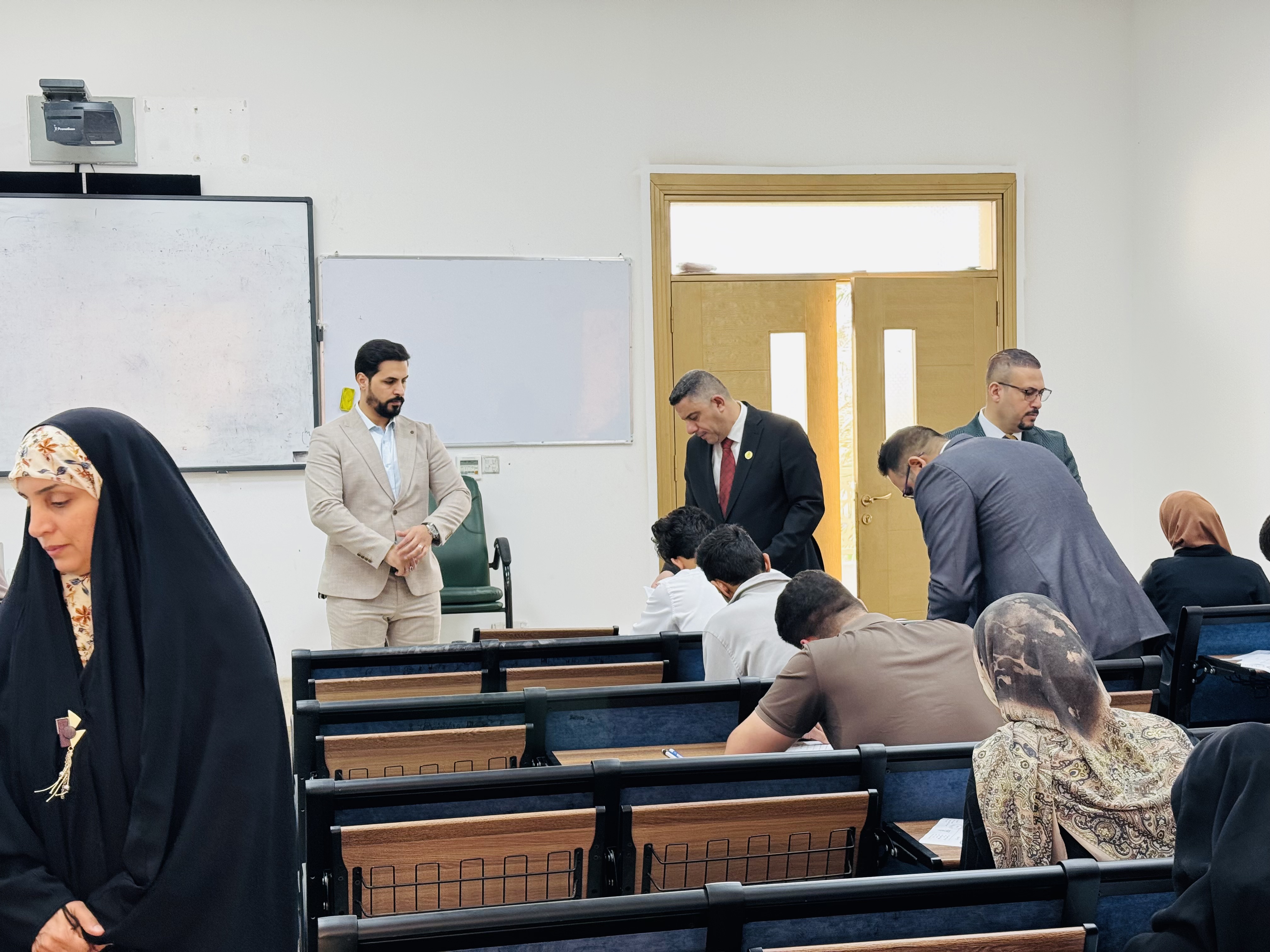 The Deanship of the College of Nursing, headed by Professor Dr. Murtadha Al-Jubouri, Dean of the College, and attended by the Administrative and Scientific Assistant conducted an inspection tour of the examination halls on the first day of the first-term exams for the second semester. This tour comes within the framework of monitoring the orderly and efficient conduct of the exams and providing a suitable environment for students. During the tour, the availability of all necessary exam supplies was verified. These steps reflect the Deanship's attention to detail and its commitment to providing a distinguished examination experience for students