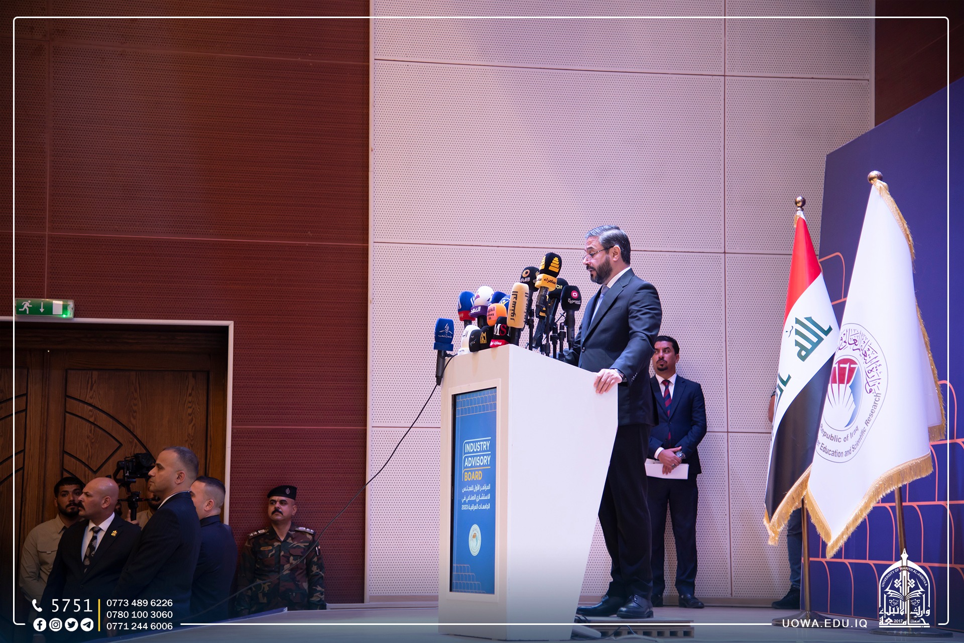Under the patronage of the Minister of Higher Education and Scientific Research, Dr. Naeem Al-Aboudi, a delegation from the University of Warith Al-Anbiyaa (Peace Be Upon Him), led by Professor Dr. Ibrahim Al-Hayawi, participated in the launch of the "First Conference of the Industrial Advisory Council in Iraqi Universities." The conference is organized by the Ministry of Higher Education and Scientific Research.