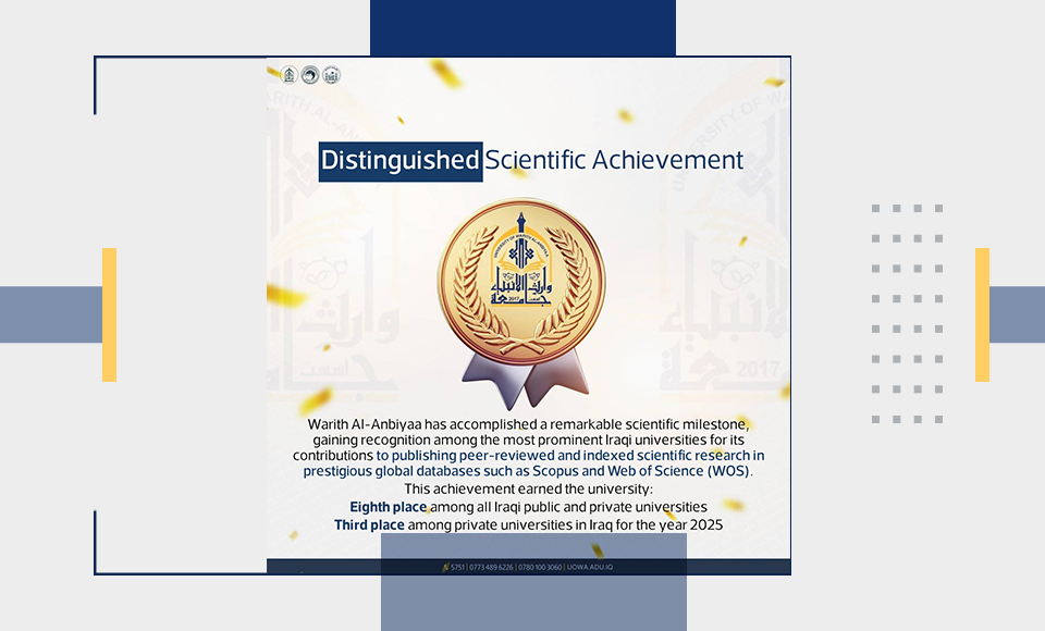 The University Warith Al-Anbiyaa (PBUH) has marked a significant scientific advancement by earning a place among Iraq’s top institutions for publishing research in internationally recognised databases such as Scopus and Web of Science.