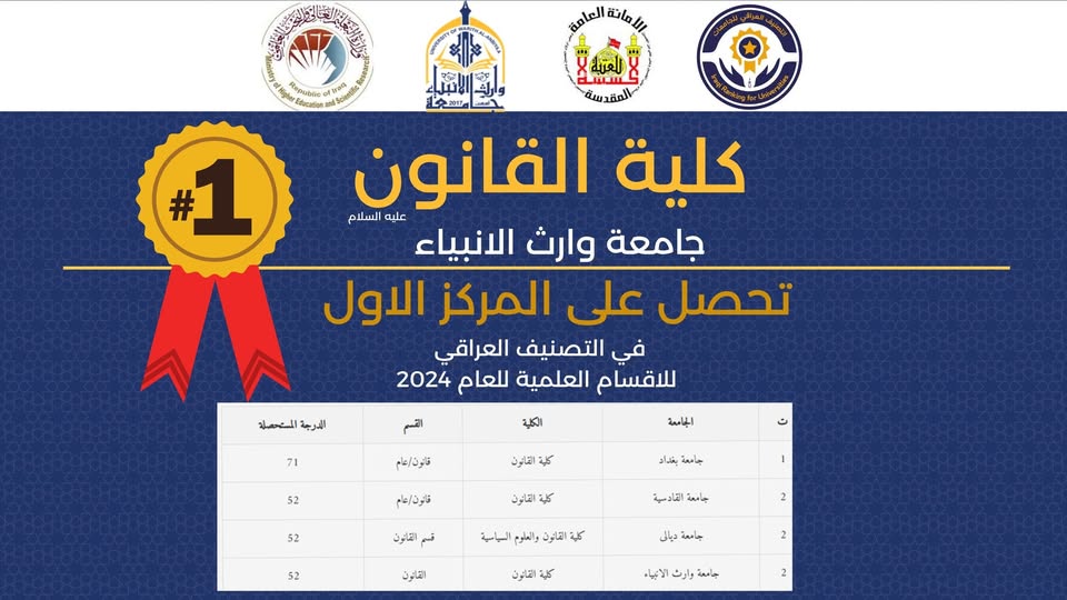 According to the Ministry of Higher Education and Scientific Research's most recent rankings, the University of Warith Al-Anbiyaa's (PBUH) College of Law has accomplished a noteworthy milestone by placing first among private universities and tied for second place among all Iraqi universities. This success is a testament to the administration, faculty, and staff of the college's hard work in reaching and surpassing academic excellence criteria.