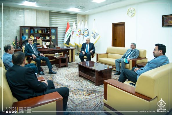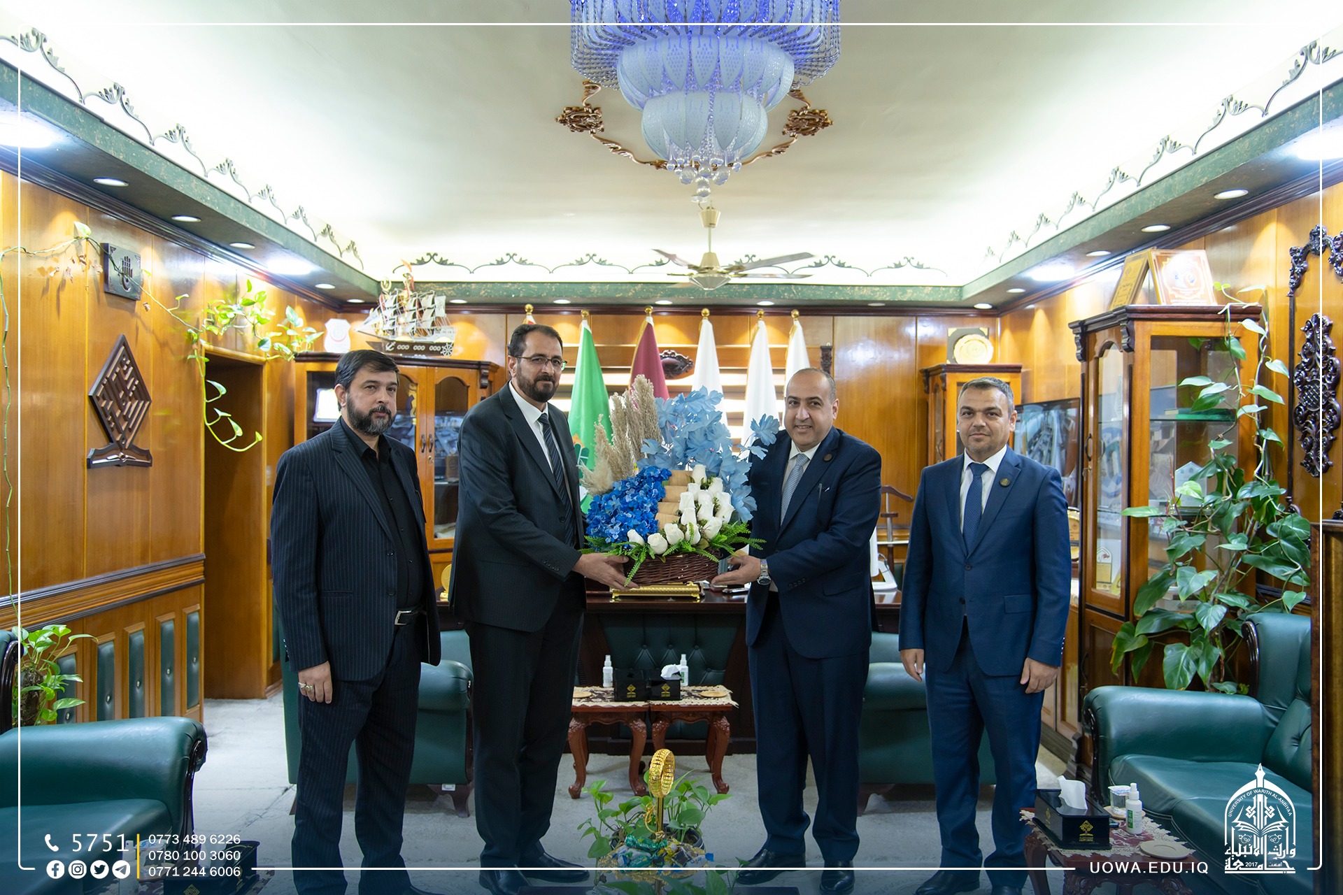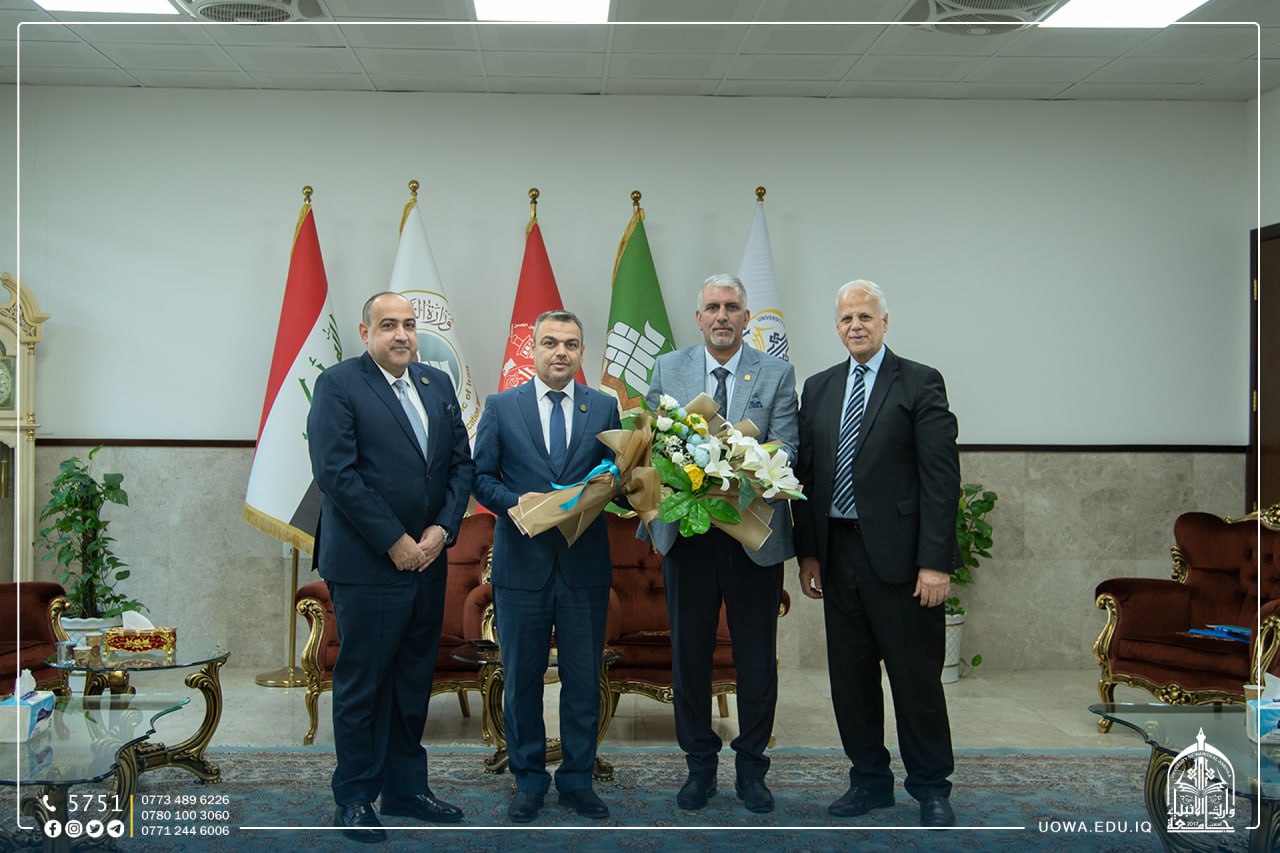The President of the University, Professor Dr. Ibrahim Al-Hayawi, received the President of the University of Karbala, Professor Dr. Basim Khalil Al-Saadi, along with the Administrative Assistant, Professor Dr. Akram Al-Yasiri, who visited the university to offer congratulations to Professor Dr. Waqad Al-Mousawi on the occasion of his appointment as the Assistant President of the University for Scientific Affairs. They prayed to Allah, the Almighty, for his continued success in the path of knowledge and his service to our beloved country.