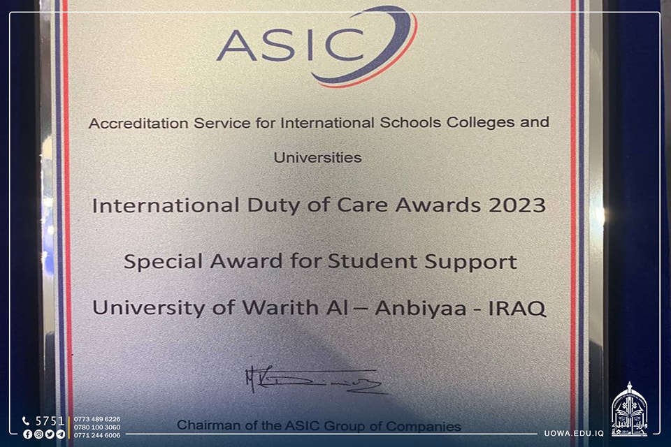 The Director of the Center for Continuing Education, Assistant Professor Dr. Haider Al-Ghanimi, and the Head of the Quality Assurance Department, Assistant Lecturer Hussein Hazim, participated in the international conference organized by the British organization ASIC (Academic and Institutional Accreditation). ASIC is an accreditation body for various international universities, institutes, and other academic institutions. The conference was held under the theme "The Impact and Results of Quality in Global Education." The university was honored with the Excellence Shield for its efforts in supporting students in various areas, including scholarships, discounts, and voluntary work in community service.